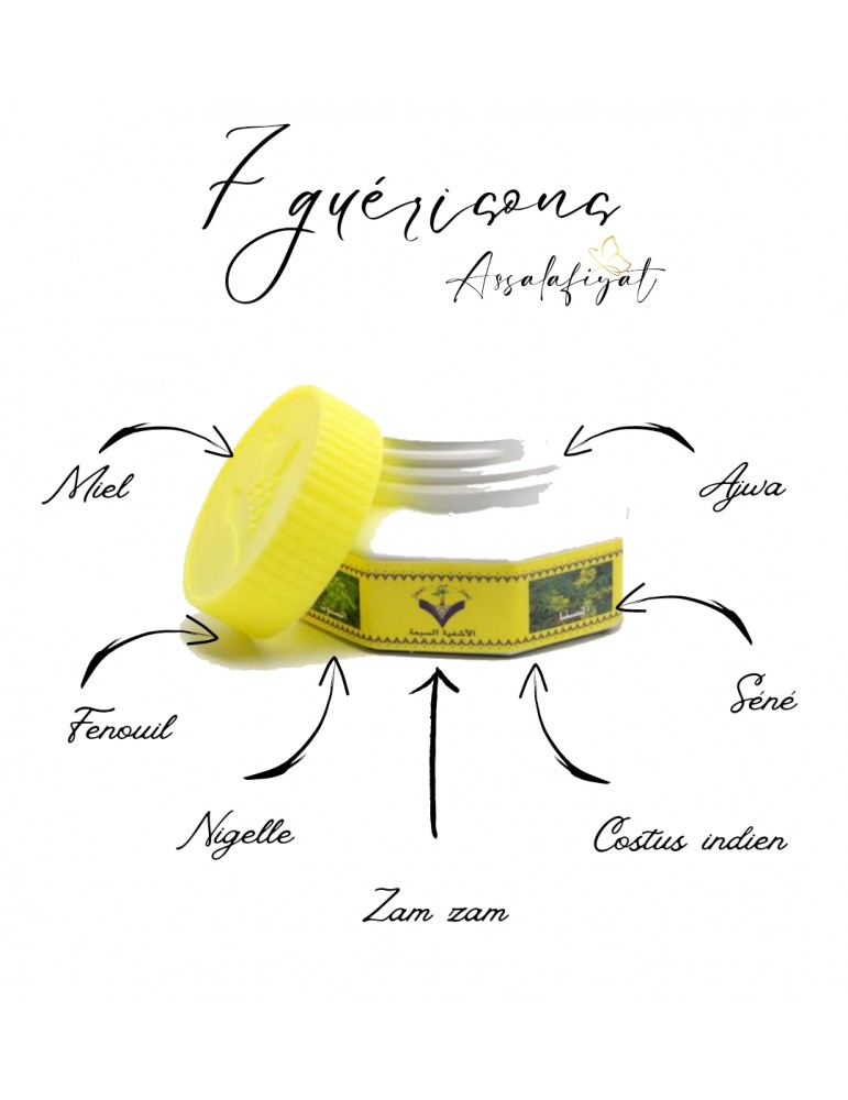 Fruit du travail d'un centre de recherche Saoudien de Médine, ce pot est composé de 7 ingrédients : Miel, datte ajwa, graine de nigelle, costus indien, feuille de séné, fenouil et eau de zamzam. Tous ces remèdes ont été savamment dosés pour être une cause de guérison pour de nombreuses maladies (maladies chroniques abdominales, prévention des rumeurs, anémie, diarrhée et constipation, douleurs articulaires et rhumatismes aigus, soulager le vitiligo, etc)